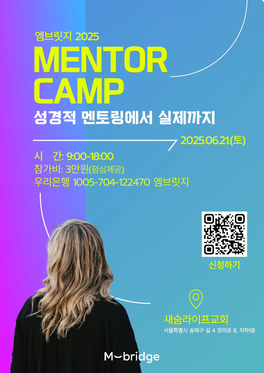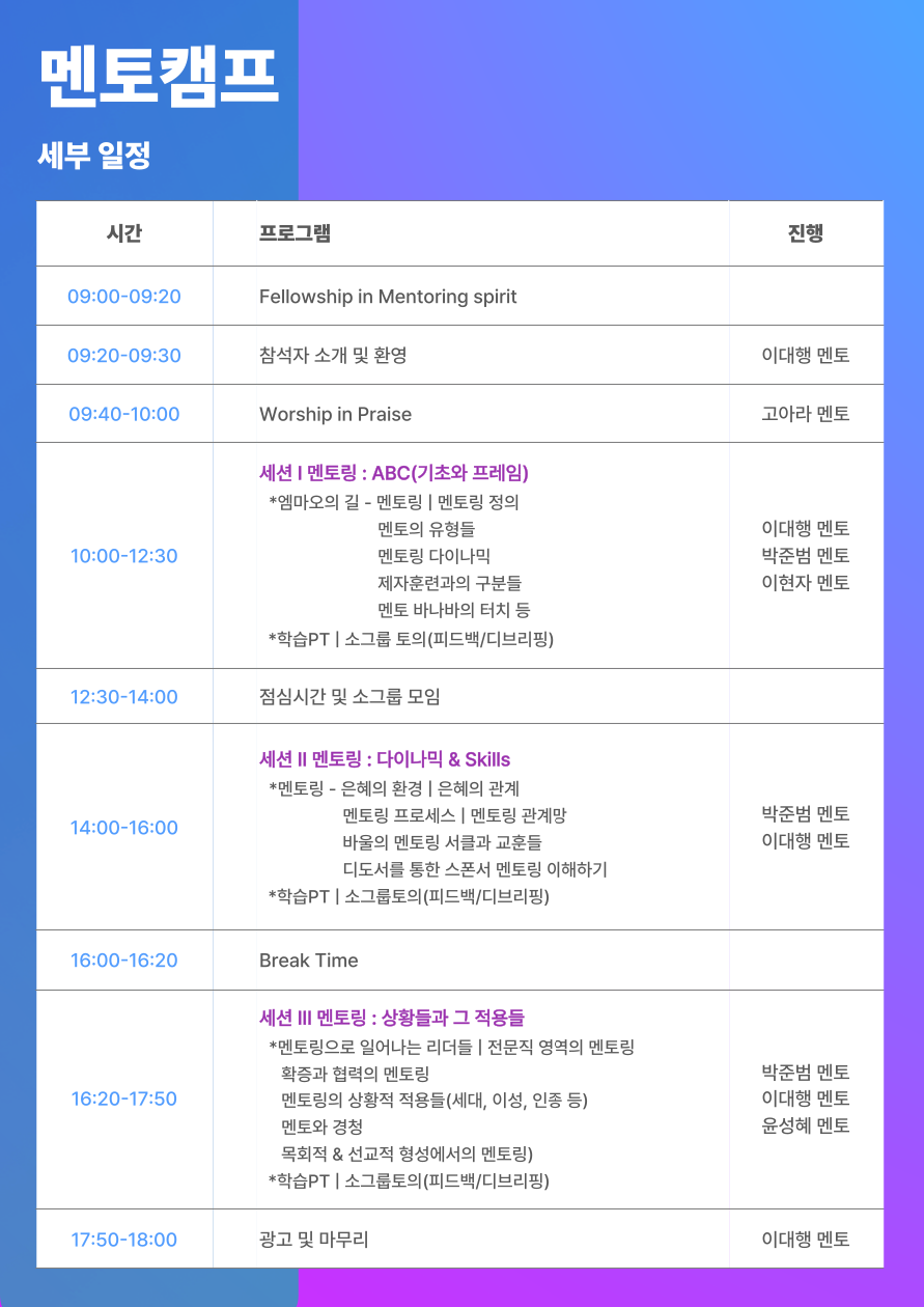 본 멘토 캠프는 이 시대에 다양한 리더로 살아가는 여러분의 멘토 됨(being mentor)을 돕는 영감과 지혜를 위한 시간입니다. 이 캠프를 통해 멘티에 대한 이해를 갖는 시간이 될 것입니다. 더욱더 멘토 됨의 삶과 사역을 배우는 시간 되시기를 바랍니다.