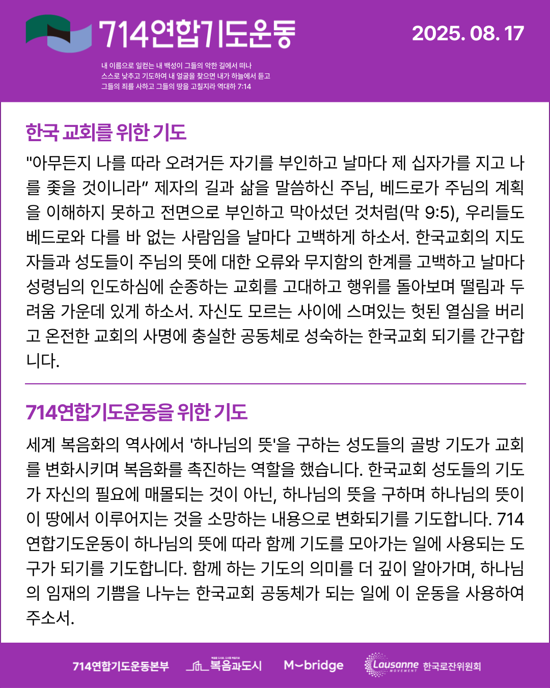 2025년 1월 부터 본격화된 714연합기도운동(공동대표 : 이인호 목사, 이재훈 목사, 최병락목사)의 기획과 행정으로 엠브릿지가 동역하고 있습니다. 이 사역은 한국교회의 연합기도운동으로 자리매김되고 있습니다.